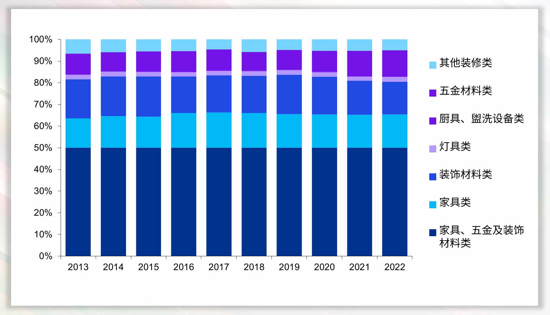 2013年-2022年按品类划分的家居建筑材料市场行业规模占比 数据如下: