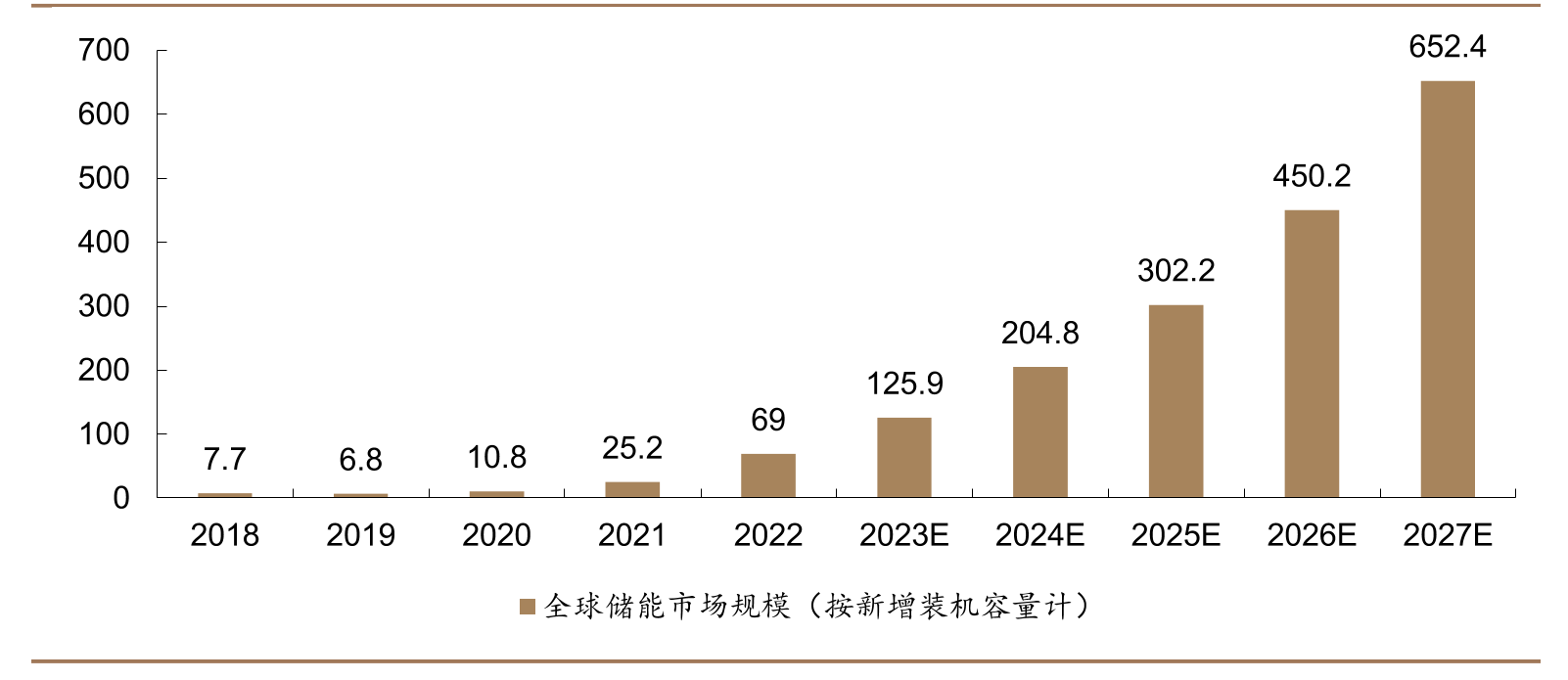 按新增装机容量计的全球储能市场规模(2018年至2027年(预测)) 数据如下: