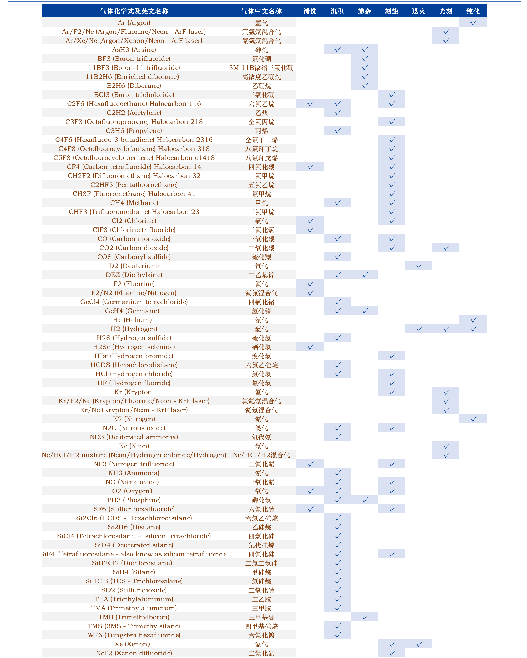 半导体级特气种类及应用制程(按化学式字母排列) 数据如下: