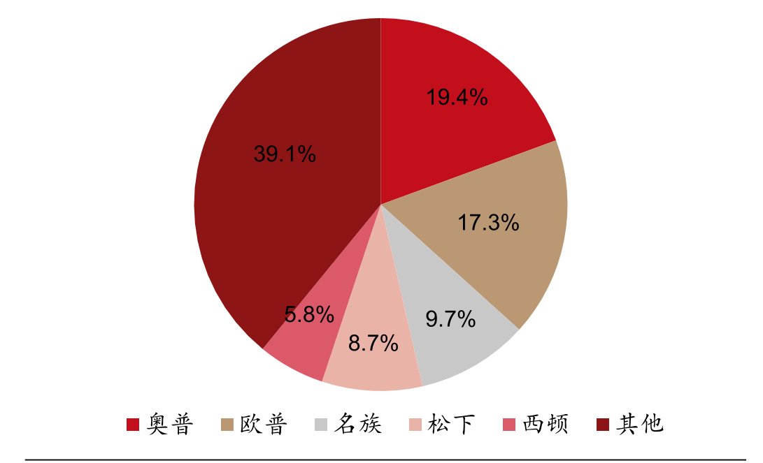 欧普以39.1%的份额占据市场主导地位,其次是名族和奥普,分别占有17.3%和19.4%的市场份额。