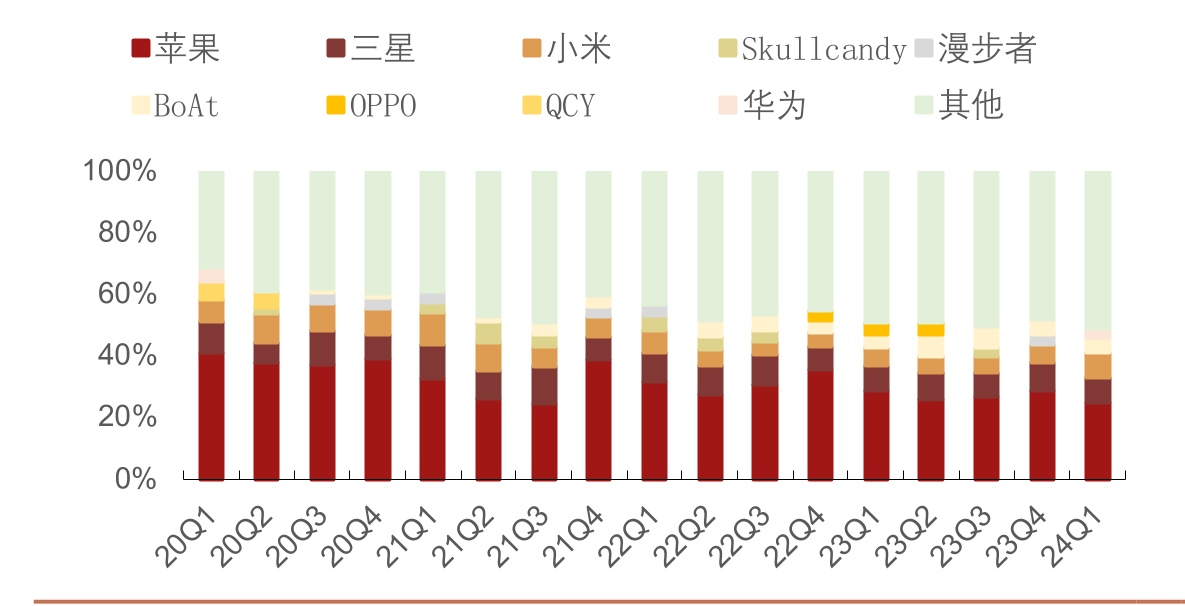 22Q3-23Q4全球智能手表品牌份额变化 数据如下: